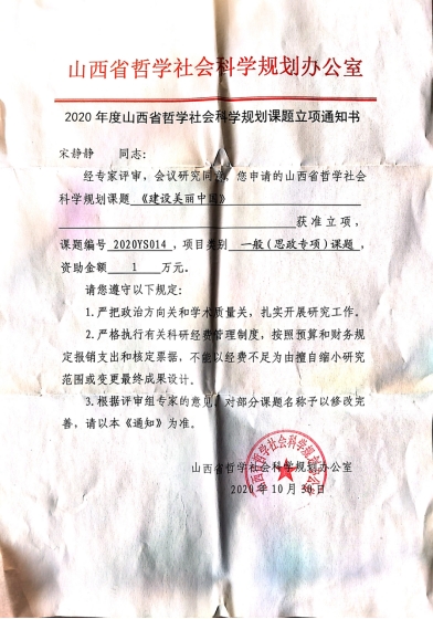 10月30日,由我部教师宋静静申报的《建设美丽中国》项目,获批山西省哲学社会科学规划课题立项课题编号2020YS014,项目类别为一般(思政专项)课题。
