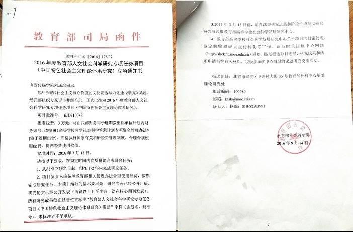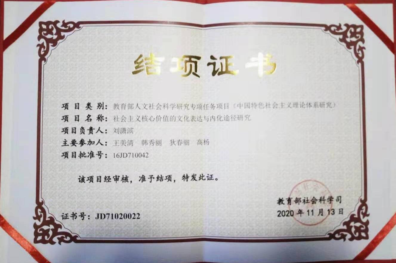 2020年11月13日,由思政部刘潇滨教授主持的教育部人文社会科学项目《社会主义核心价值的文化表达与内化途径研究》,获批结项。课题编号16JD710042,结项证书编号DJ71020022,项目类别为教育部人文社会科学专项任务项目(中国特色社会主义理论体系研究)。