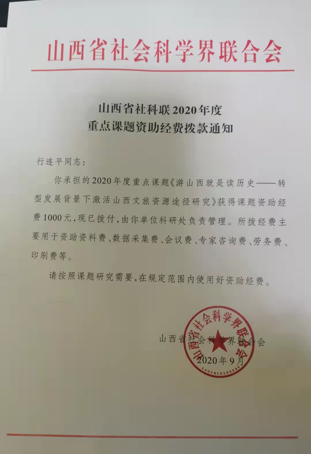 2020年9月,由我部行连平副教授申报的《游山西,就是读历史一一转型发展背景下激活山西文旅资源途径研究》,获批山西省社会科学界联合会2020-2021年度重点课题立项。