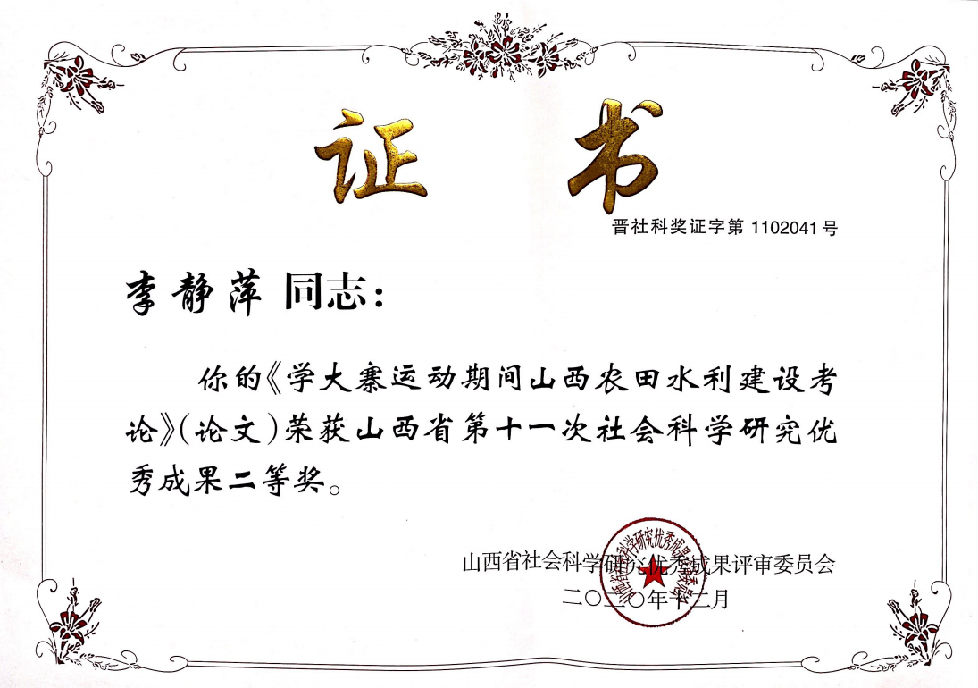 2020年12月,我部李静萍教授的论文《学大寨运动期间山西农田水利建设考论》荣获山西省第十一次社会科学研究优秀成果二等奖。晋社科奖证字第1102041号。