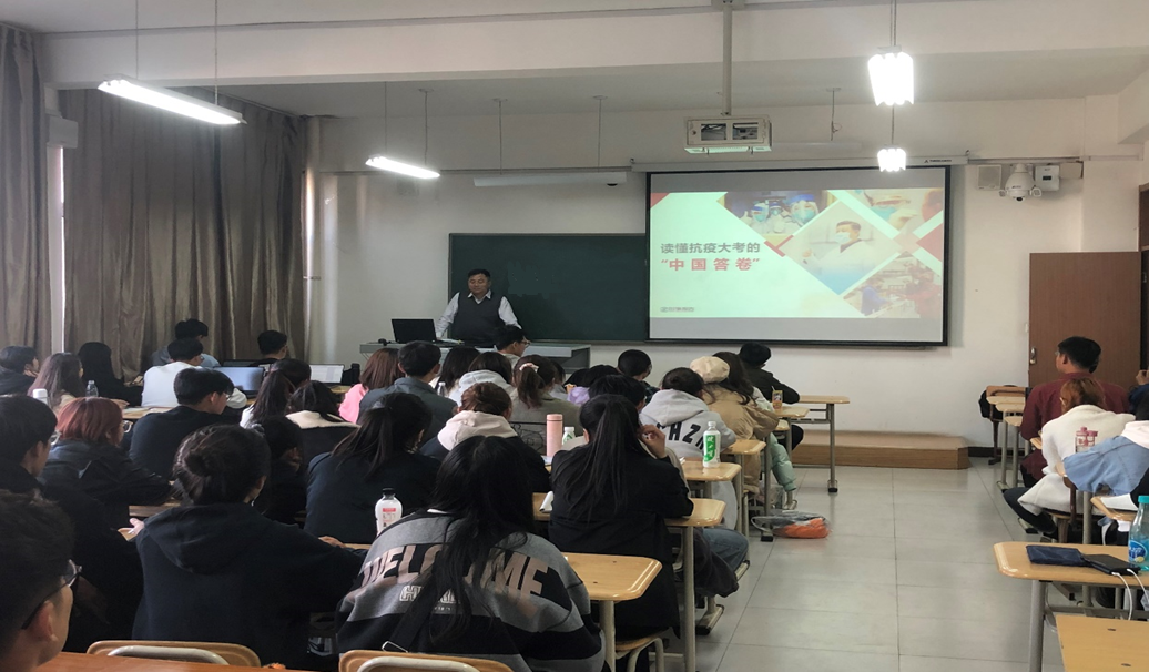 李校长充分发挥自身学科背景和工作经历优势,用生动的语言、详实的数据、鲜活的案例,为同学们全面讲授了我国抗击新冠肺炎疫情中的重要举措和取得的重要成果,展示出我国讲信义、重情义、扬正义、守道义的大国形象。让学生们再次感受到中国共产党高瞻远瞩、坚强有力的正确领导,体会到中国特色社会主义集中力量办大事的制度优势,震撼于中国人民上下同欲、无往不胜的执行力、凝聚力和战斗力,并勉励同学们立鸿鹄志,做奋斗者,要始终坚定“永远跟党走”的必胜信念,把实现个人梦、家庭梦融入到国家梦、民族梦;求真学问,练真本领,要珍惜韶华、不负青春,如饥似渴、孜孜不倦地用心学业,努力掌握科学文化知识和专业技能,努力提高人文素养,使自己的思维视野、思想观念、认识水平跟上越来越快的时代发展,将所学付诸实践、服务社会、为国效力;担当责任,扬帆远航,要以英雄模范为榜样,传承中国精神、赓续中国力量,不断锤炼自己的意志,磨砺自己的心胸,涵养“先天下之忧而忧,后天下之乐而乐”的深厚情怀,将青春、才华、热血投入到为更多人谋幸福的伟大事业中,用一生的努力、一辈子的奋斗建设美好家园。