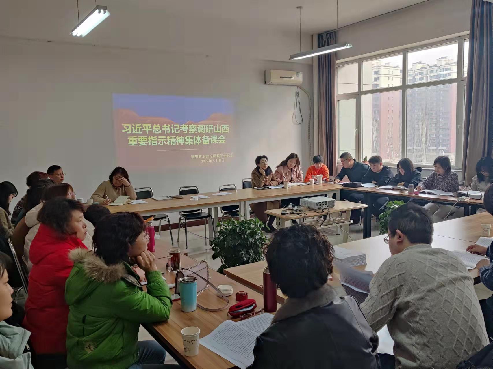 为学习贯彻落实习近平总书记考察调研山西重要指示精神,讲好“开学第一课”,及时将习近平总书记重要指示精神传达到师生,2022年2月18日下午,思想政治理论课教学研究部在图书资料室举办了习近平总书记考察调研山西重要指示精神专题教学集体备课会,会议由思想政治理论课教学研究部主任王美清主持,学校党委副书记刘锐和思想政治理论课教学研究部全体专职教师参会。