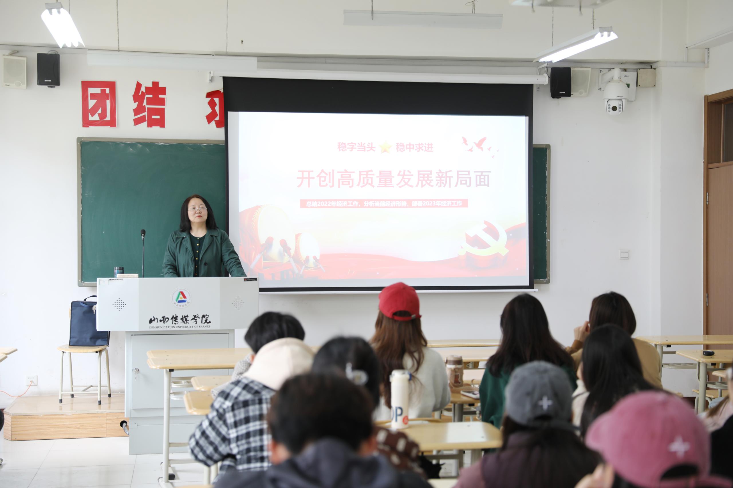 4月12日上午,王红叶副校长走进文博楼A201教室,为2021级播音与主持2班的同学们讲授了一堂主题为《开创高质量发展新局面》的形势与政策课。