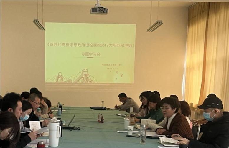 首先由王美清全文领学《新时代高校思想政治理论课教师行为规范和准则》,对《准则》提出的十二个方面的要求逐条进行学习。随后,七位教研室主任分别进行了交流发言。对照《准则》提出的十二个方面要求谈了学习的心得体会。