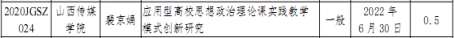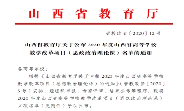 近日,我部裴京娟副教授申报的《应用型高校思想政治理论课实践教学模式创新研究》教学改革项目,获批2020年度山西省高等学校教学改革项目(思想政治理论课)立项,项目编号2020JGSZ024,项目类别为一般课题。