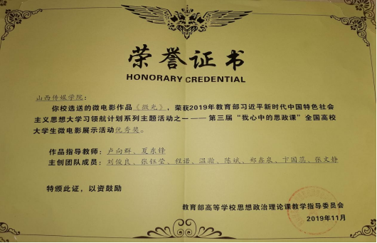 为了深入贯彻落实全国高校思想政治工作会议精神,切实增强学生对思政课的获得感,提升学生对思政课的参与度,根据《教育部办公厅关于开展高校学生思想政治理论课学习成果展示系列主题活动的通知》要求,思想政治理论课教学研究部卢向群老师指导我校大学生以《微光》为主题、用“微电影”的方式,展现学生理想中的思政课和思政课教学过程中的精彩故事。经评委会评选,我校选送的微电影作品《微光》,荣获2019年教育部习近平新时代中国特色社会主义思想大学生领航计划系列主题活动之一--第三届“我心中的思政课”全国高校大学生微电影展示活动优秀奖。