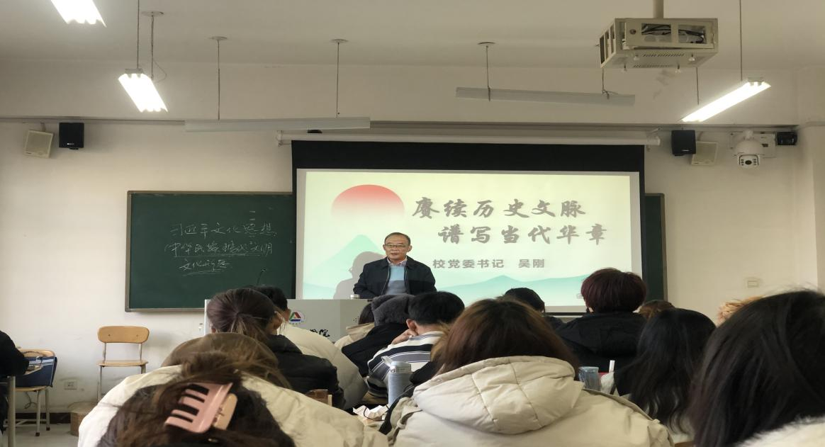 11月16日,校党委书记吴刚为2022级网新一班全体同学讲授以“赓续历史文脉 谱写当代华章”为主题的“形势与政策”课。